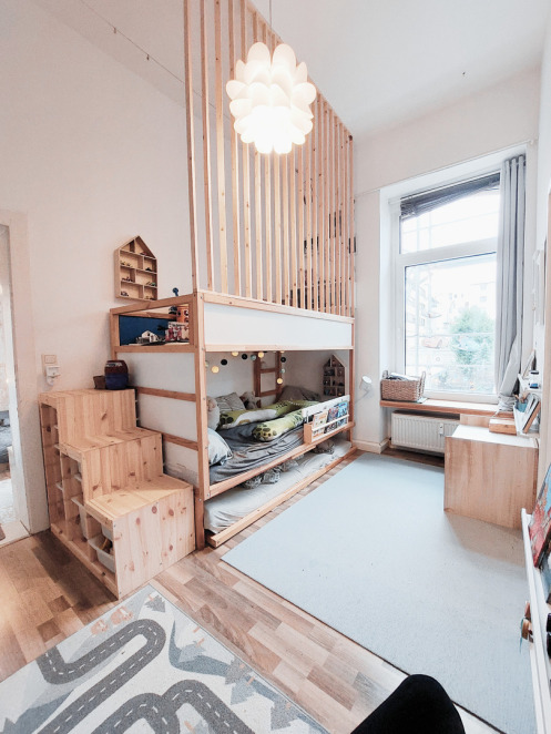 Das Hochbett wurde daher umgebaut.Oben ein kleiner Spielbereich, unten ein zusätzlich ausziehbares Bett für die 2 Racker.Ein Treppenregal für den Hochbereich mit viel Platz für Spielsachen.