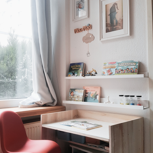 Eine Sitzfensterbank, ein kleiner selbstgebauter Maltisch,Bücherleisten und ein weiteres Regal in kindgerechter Greifhöhe für die Spielsachen.