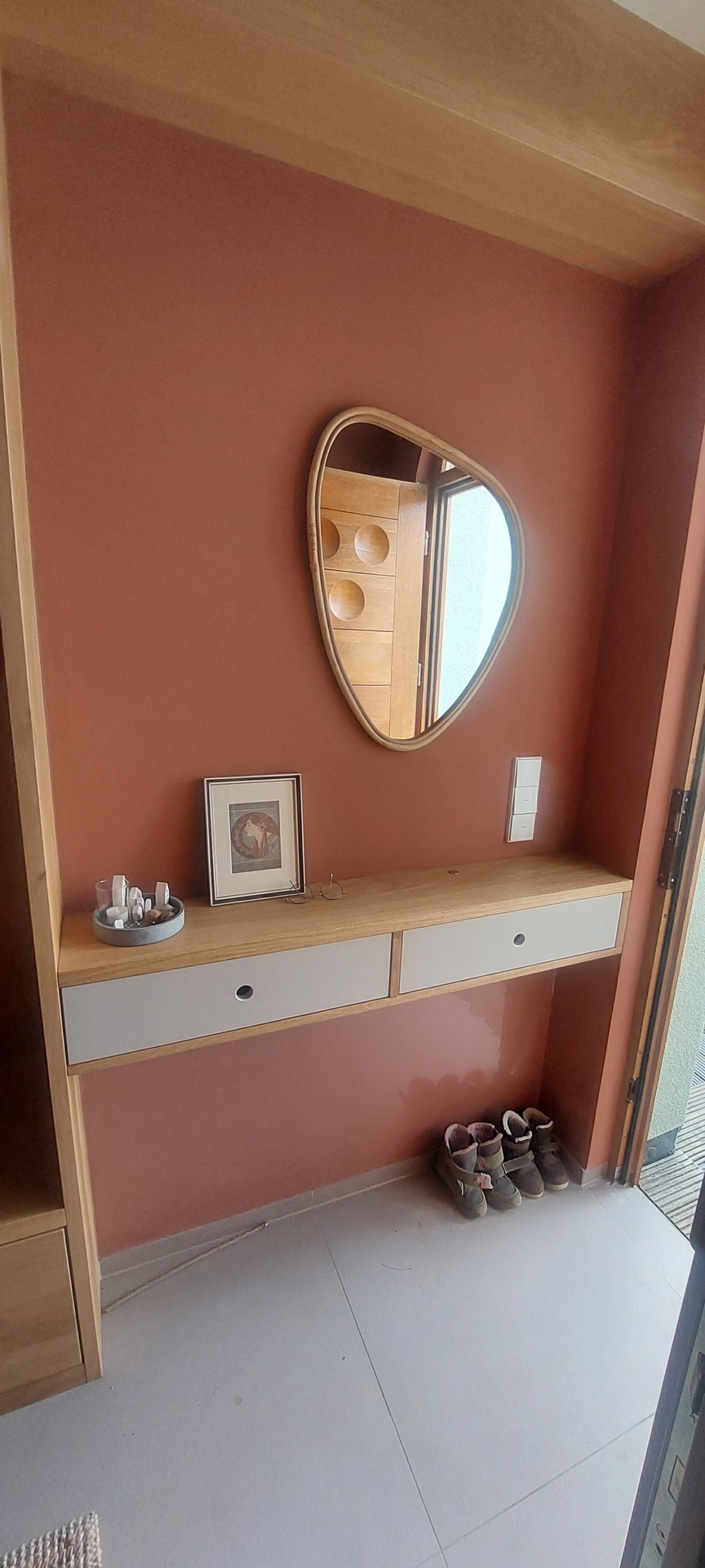 Da die im Bau dafür eingeplante Nische nicht Tief genug war, um einen Einbauschrank komplett darin verschwinden zu lassen,habe ich ein Möbel geplant,welches aus der Wand schaut und den Nebenbereich integriert.Dort gab es dann eine Ablage mit Schubladen und Platz für einen Spiegel.