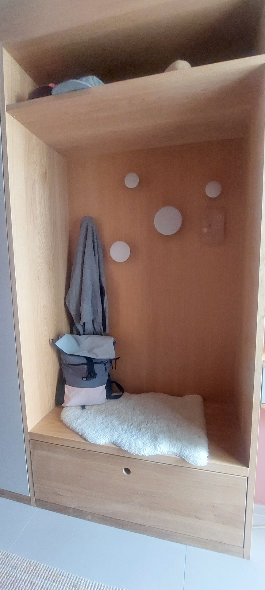 Im geschlossenen Schrank gibt es Platz für Jacken und Kisten für Kleinkram.