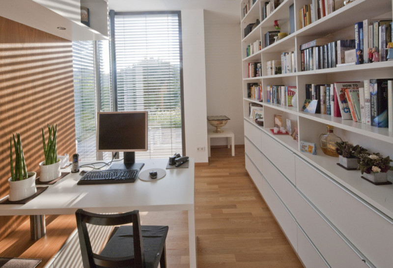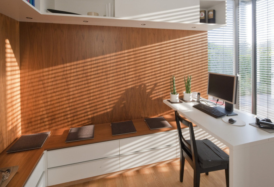 In der gegenüberliegenden Ecke bietet eine Sitzfläche mit integrierten Schreibtisch Platz zum Arbeiten, oder Lesen mit Blick in den Garten.