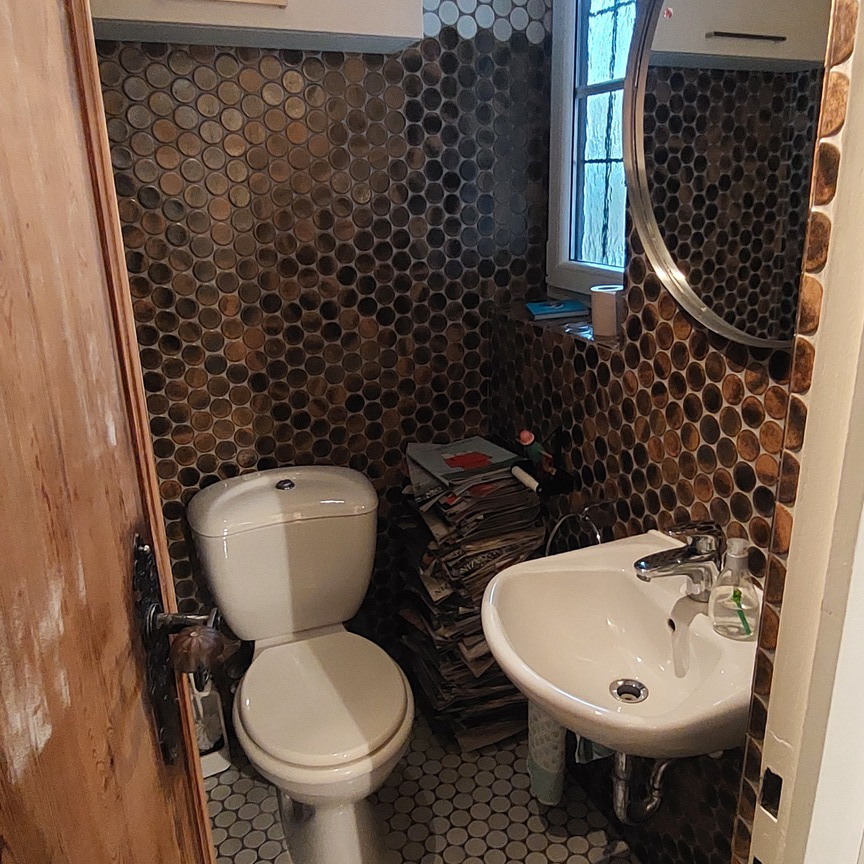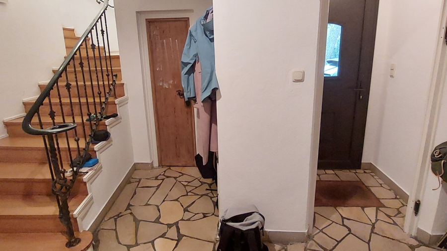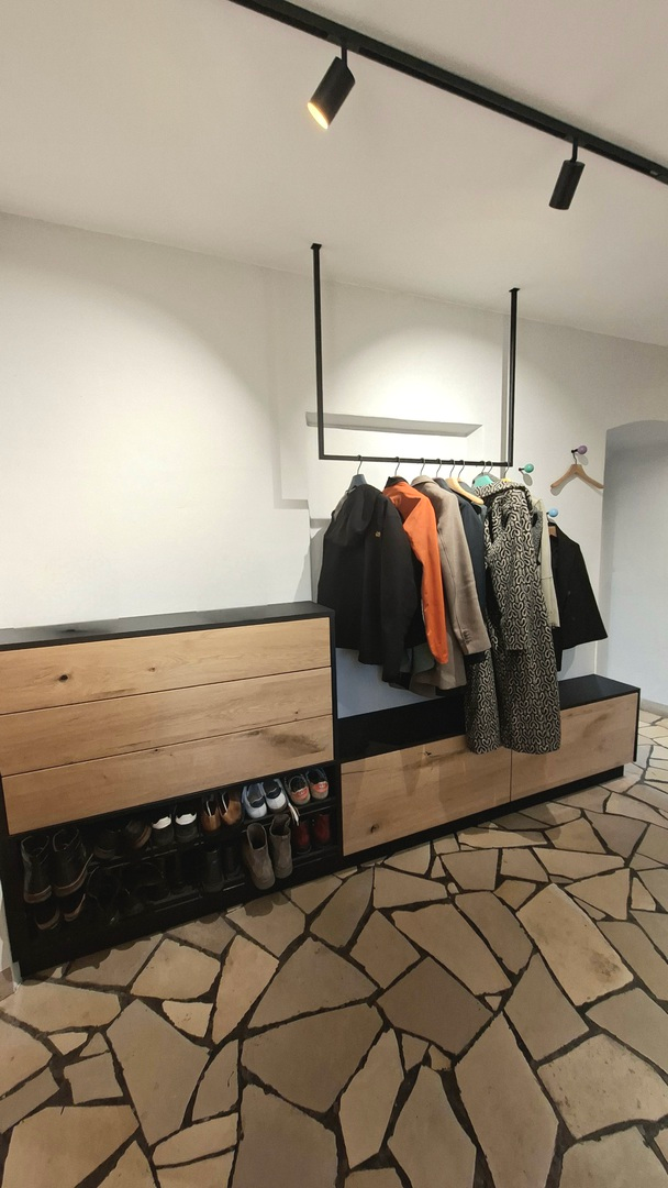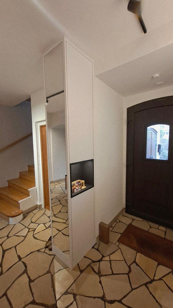 Der Eingangsbereich wurde vollständig umgeplant und neu zoniert. Eine unnötige Tür wurde geschlossen und eine integrierte Garderobe bildet nun dort den funktionalen Auftakt des Hauses. Hierfür wurden passgenaue Möbel entworfen, das Stauraum, Sitzfläche und Ordnung elegant miteinander verbindet. Gleichzeitig wurde das bestehende Gäste-WC zu einem vollwertigen Gästebad vergrößert und neu gestaltet.