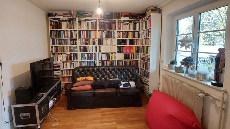 Der angrenzende Bibliotheksbereich erhielt eine neue räumliche Struktur. Ein umlaufendes, raumhohes Bücherregal bildet das gestalterische Herzstück und eine Chaiselounge lädt zum schmökern ein.