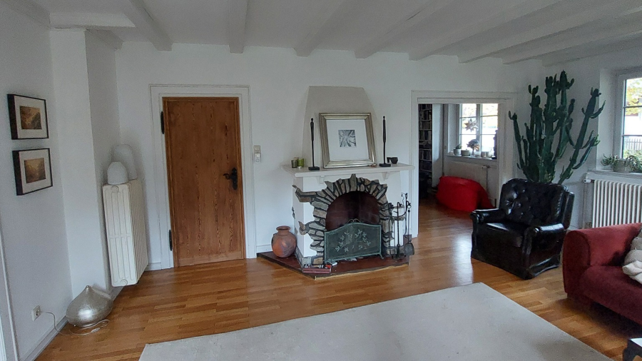 Im Wohn- und Essbereich lag der Fokus auf einer atmosphärischen Aufwertung. Ein neuer Kamin schafft einen zentralen Blickpunkt und zusätzliche Wohnqualität. Der bestehende Parkettboden wurde überarbeitet und in das neue Gestaltungskonzept integriert. Ergänzt wurde der Raum durch eine neue Wandfarbgestaltung sowie ein individuell abgestimmtes Medienkonzept mit Leinwand, Beamer und Soundsystem – dezent integriert und dennoch technisch auf dem neuesten Stand.